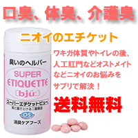 ワキガ体質、加齢臭、人工肛門などのオストメイトの方などニオイで弱気にならないで!20人への3日間便臭アンケート調査で95%の方が軽減、非常に軽減したと効果を実感(メーカー調査)もうニオイ気にしない!内容量:180粒2ヶ月分飲み方:毎食後または食間に1粒ずつ噛まずにお召し上がり下さい。